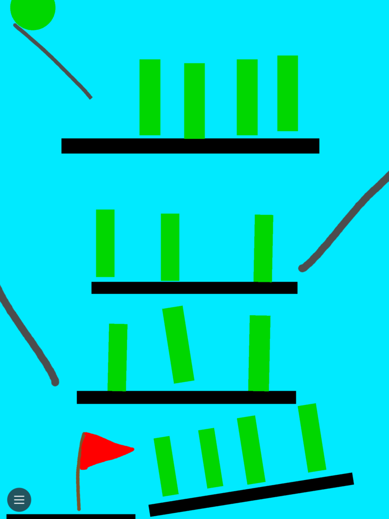 ドミノ倒しのゲームは、見た目の単調さとは相反するように、制作が難しい作品となります。アイテムのサイズや並べる間隔を調整しながら作成しないといけないので、何度も再調整をしながら作成を制作しています。イラストの色のバランスも考えている様子もあり、制作したお子さんの狙い通り何度も繰り返し見たくなる作品になっています。